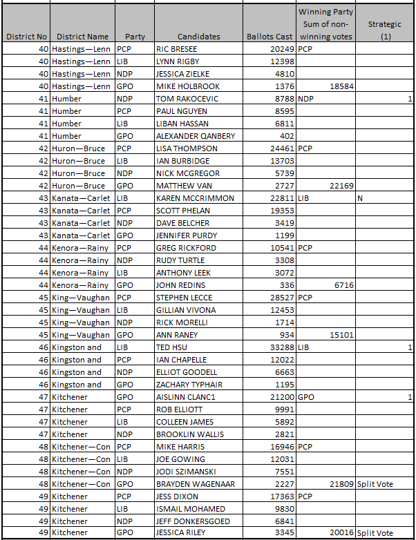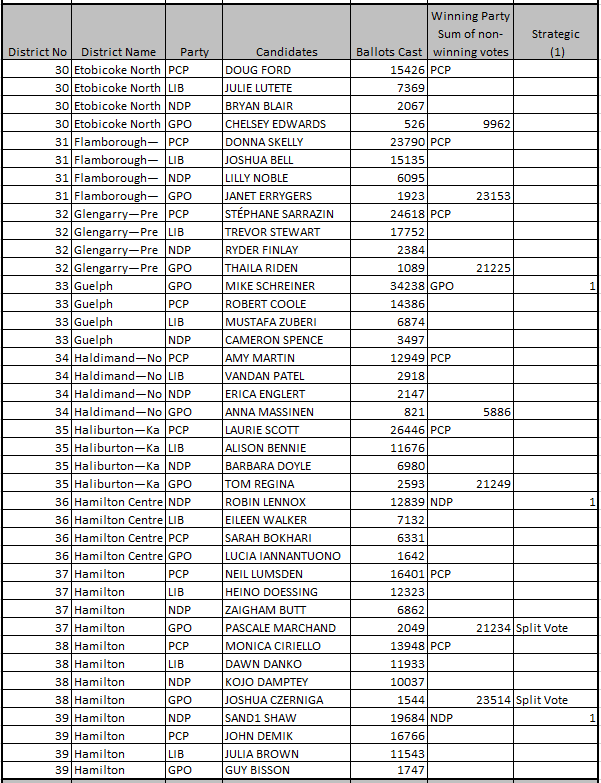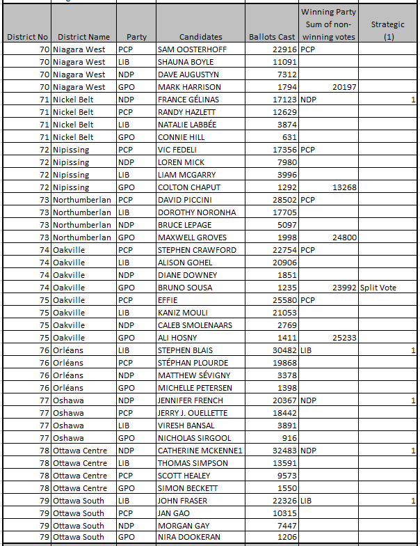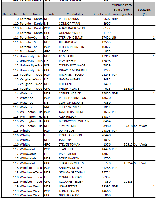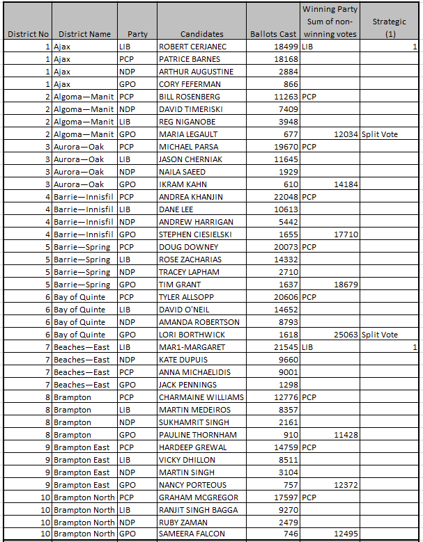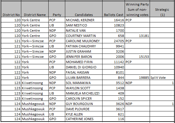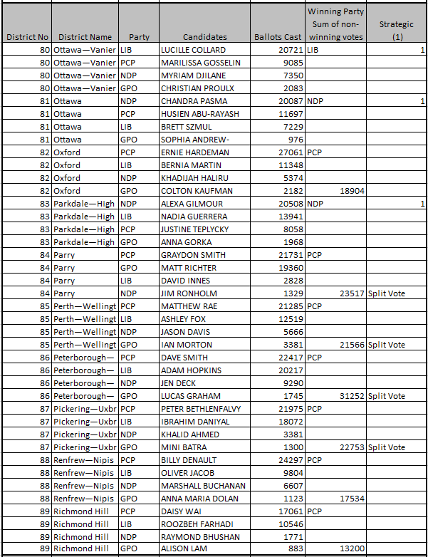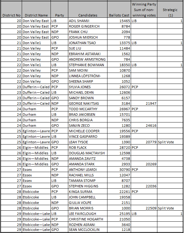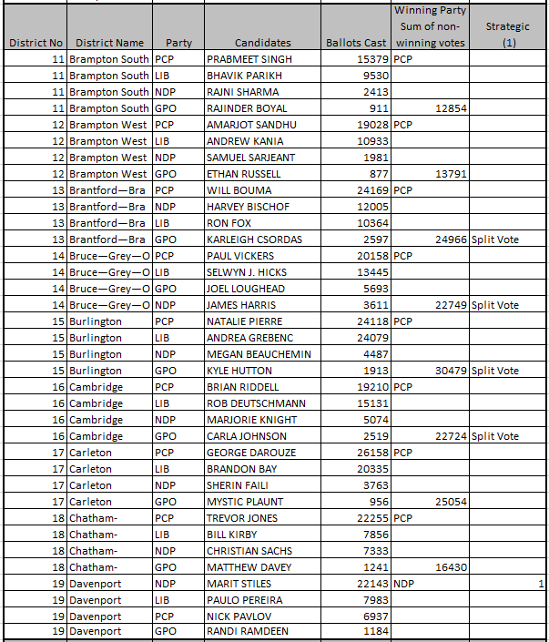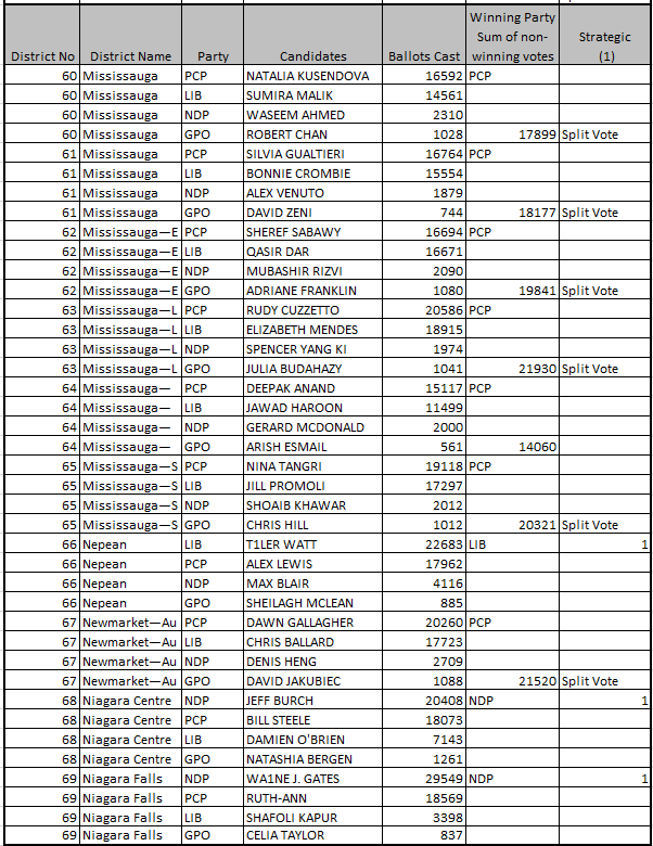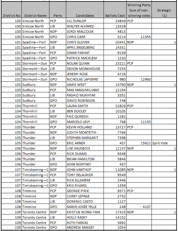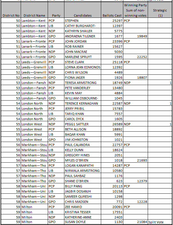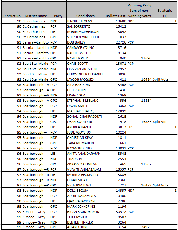 Where the PCP (Progressive Conservatives) won, the total of NDP/LIB/GPO votes is recorded. Where the total is greater than the winning total a “Split Vote” is indicated under the Strategic column. Where the winner was a previously identified Strategic candidate, a 1 is recorded under Strategic.